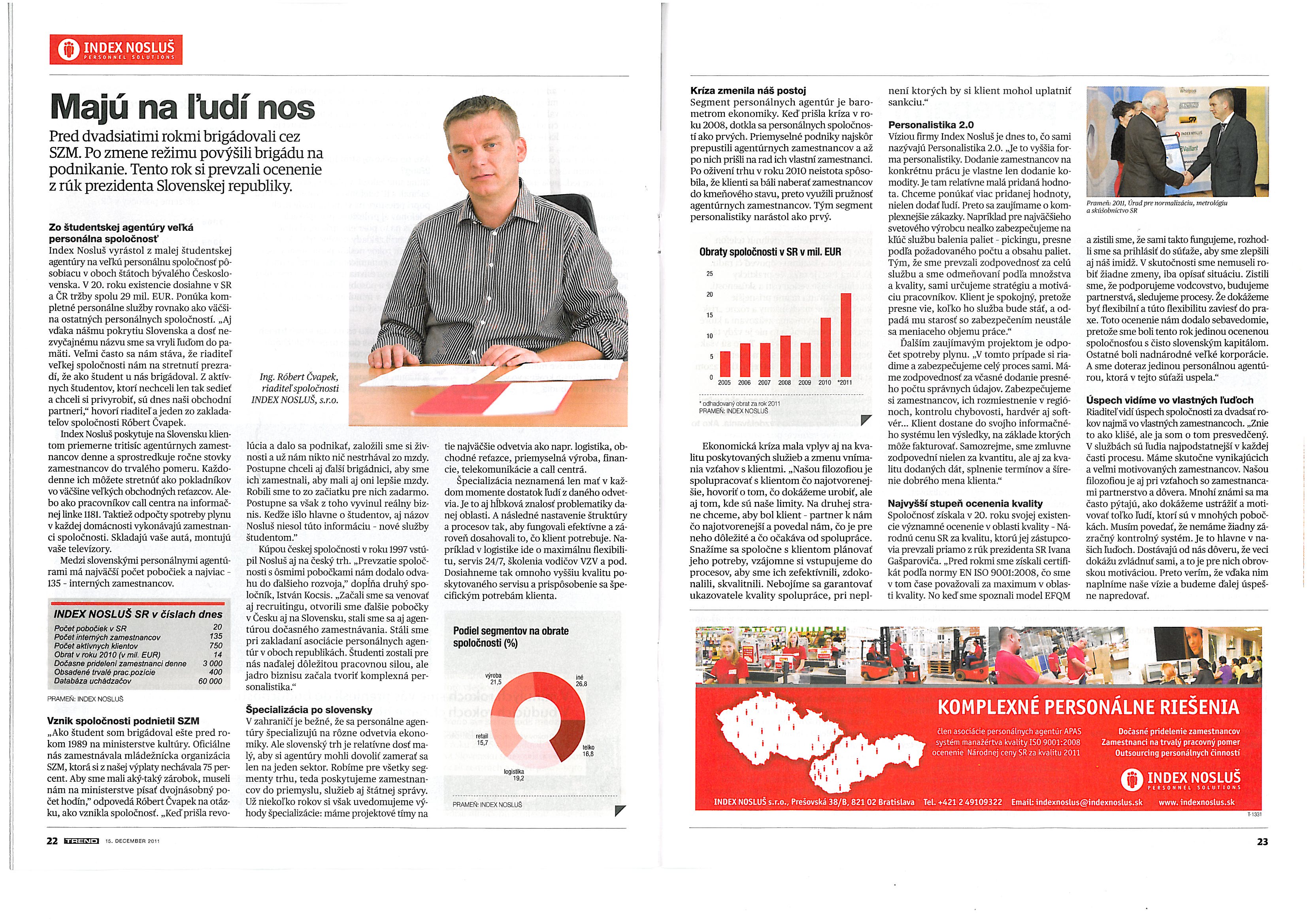 15.12.2011 v špecializovanej prílohe EXTRA V PODNIKANÍ týždenníka TREND je medzi inými uspešnými spoločnosťami aj úspešný príbeh našej spoločnosti a jej pôsobenie an trhu celé dve dekády.