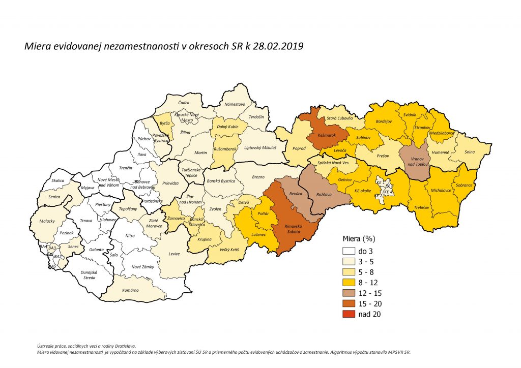 Prehľad nezamestnanosti v okresoch SR – február 2019