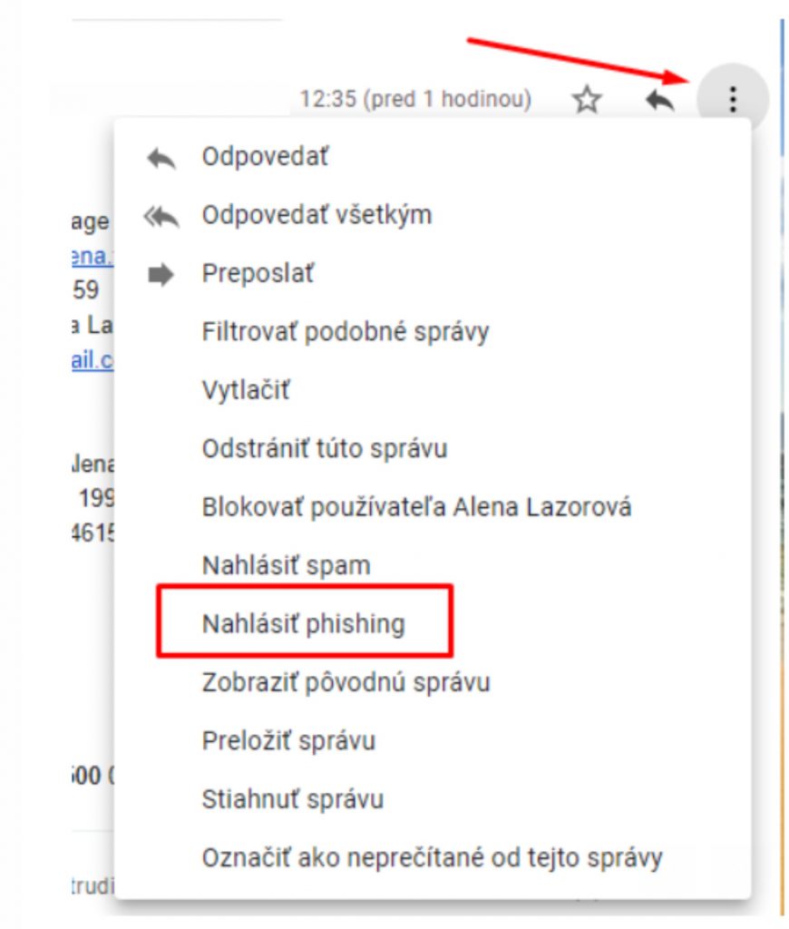 Daný e-mail a aj mailovú adresu pracanoslus@gmail.com môžete označiť ako falošný. Urobíte to nasledovne:  Hore pri e-mailovej adrese vidíte 3 bodky, na tie keď kliknete zobrazia sa Vám možnosti, kde si vyberiete Nahlásiť phishing.