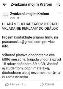 Opakovane Vás upozorňujeme na podvodnú ponuku práce, ktorá sa šíri najmä na Facebooku. Ide o ponuku – VKLADANIE REKLAMY DO OBÁLOK. Na prvý pohľad lákavá ponuka sa objavuje vo viacerých skupinách na Facebooku.