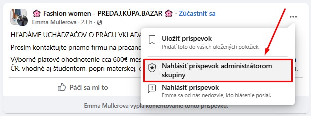 Pomôžte nám, aby sa takéto príspevky ďalej nešírili. Príspevok nahláste správcovi skupiny ako podvodnú ponuku. Urobíte to tak, že po kliknutí na tri bodky (pravom hornom roku ponuky) vyberiete možnosť „Nahlásiť príspevok administrátorom“. Vyberte problém „Falošná správa„. Týmito krátkymi krokmi ste zabránili ďalšiemu šíreniu podvodného príspevku. Ďakujeme.
