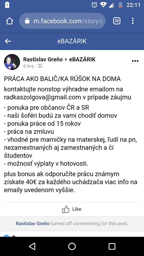 Ponuka „práce“ sa šíri cez rôzne skupiny na Facebooku. Kontaktujú náš poškodení, ktorým sa niekto „nabúral“ do ich konta a cez ich profil zverejňuje ponuku v skupinách.