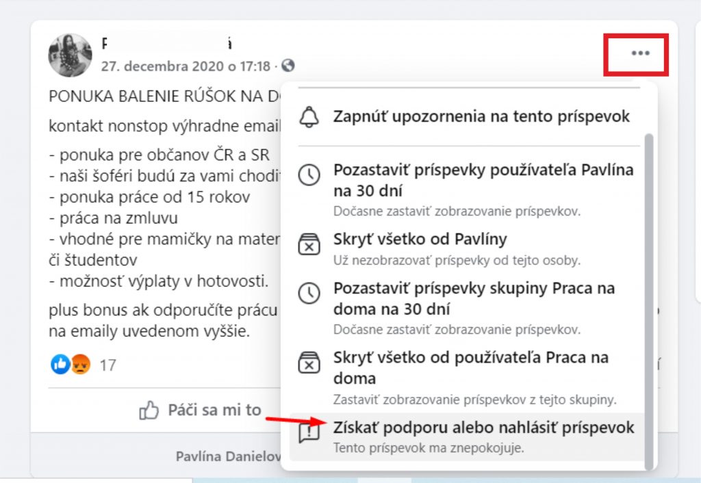 Pomôžte nám, aby sa takéto príspevky ďalej nešírili. Príspevok nahláste správcovi skupiny ako podvodnú ponuku. Urobíte to tak, že po kliknutí na tri bodky (pravom hornom roku ponuky) vyberiete možnosť „Získať podporu alebo nahlásiť príspevok“. Vyberte problém „Falošná správa„. Týmito krátkymi krokmi ste zabránili ďalšiemu šíreniu podvodného príspevku. Ďakujeme.