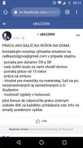 Opakovane Vás upozorňujeme na podvodnú ponuku práce, ktorá sa šíri najmä na Facebooku. Ide o ponuku – PRÁCA NA DOMA BALIČ/KA RÚŠOK. Na prvý pohľad lákavá ponuka sa objavuje vo viacerých skupinách na Facebooku.
