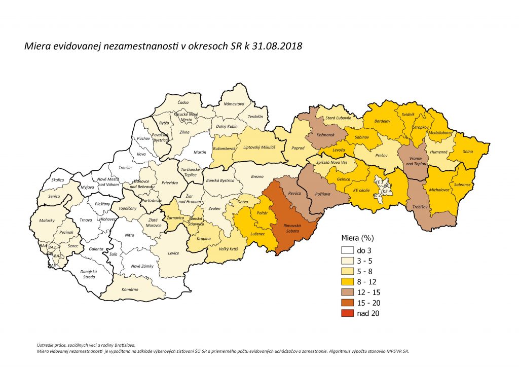 Prehľad nezamestnanosti v okresoch SR – august 2018