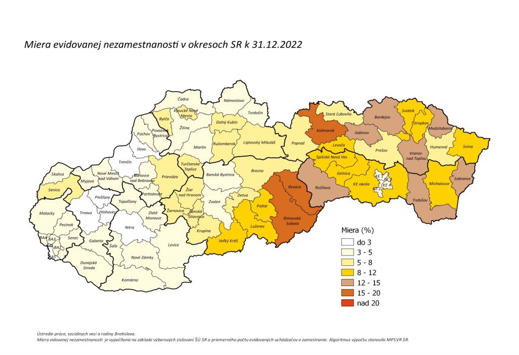 Miera evidovanej nezamestanosti v okresoch SR k 31. decembru 2022