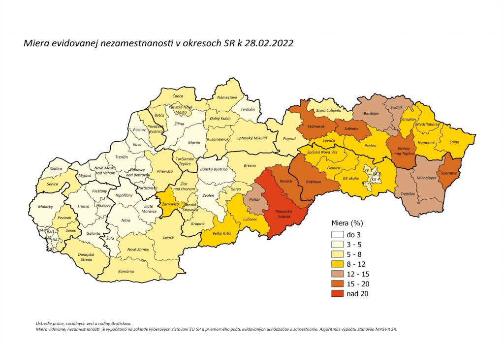Prehľad nezamestnanosti v okresoch SR – február 2022