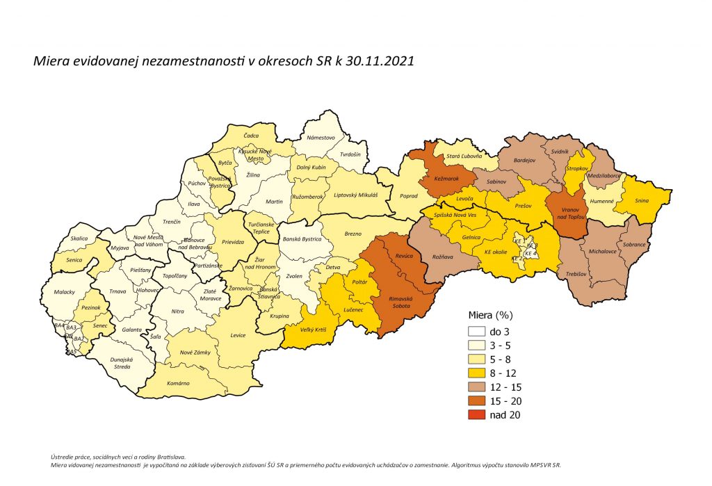 Miera evidovanej nezamestnanosti v okresoch SR k 30. novembru 2021