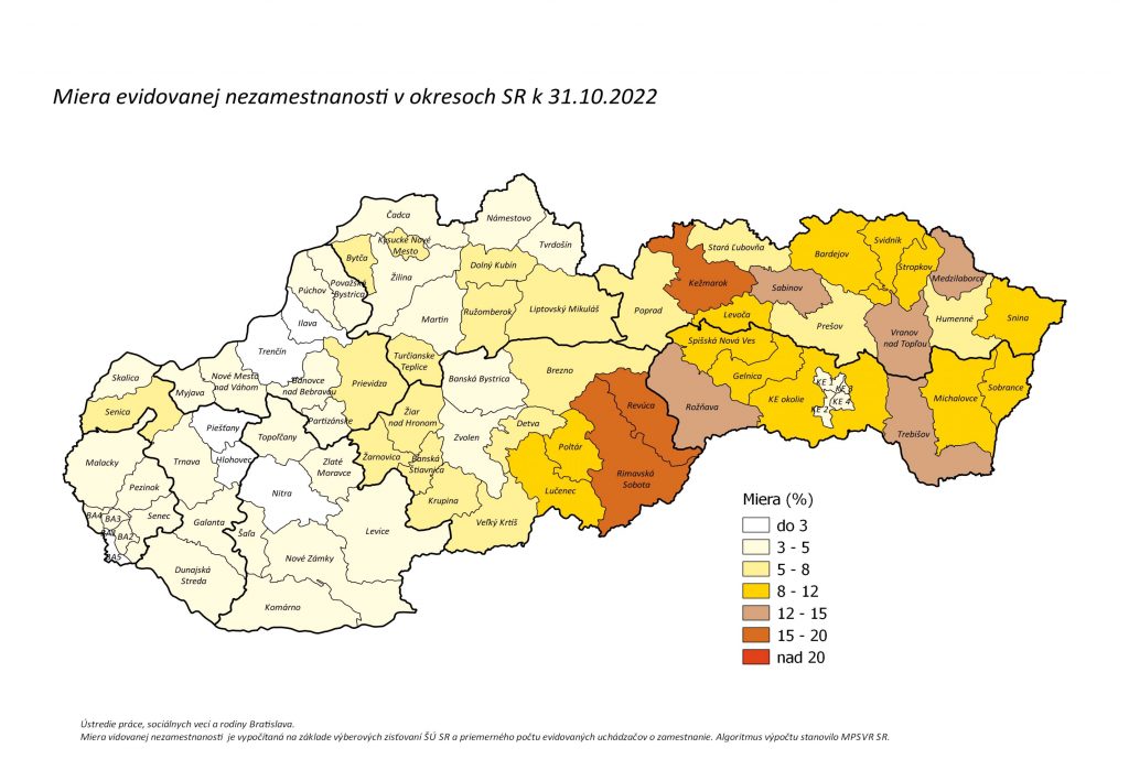 Miera evidovanej nezamestnanosti v okresoch SR k 31. októbru 2022