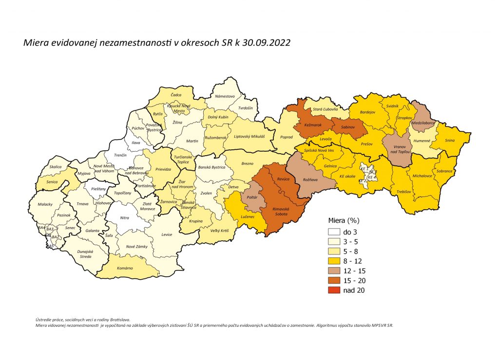 Miera evidovanej nezamestnanosti v okresoch SR k 30. septembru 2022
